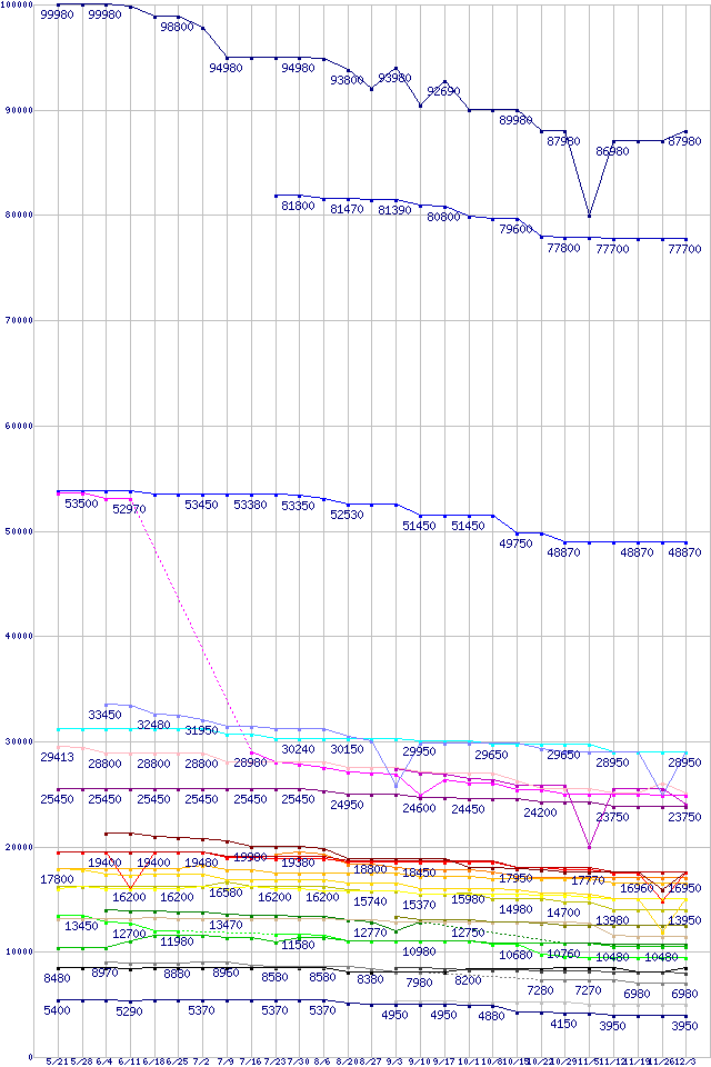 Intel系CPUの最安値推移↑前グラフ↓次グラフ(2010年5月21日〜2010年12月3日)※このグラフは過去のデータも税率5%相当に調整した税込み相当額のグラフです。凡例Core i7-980X Extreme Edition (3.33GHz)Core i7-970 (3.2GHz)Core i7-960 (3.20GHz)Core i7-875K (2.93GHz)Core 2 Quad Q9650 (3.00GHz,L2 6MB×2)Core i5-680 (3.6GHz)Core i7-870 (2.93GHz)Core i7-950 (3.06GHz)Core 2 Quad Q9550 (2.83GHz,L2 6MB×2)Core i5-655K (3.2GHz)Core i5-661 (3.33GHz)Core i5-660 (3.33GHz)Core i5-760 (2.8GHz)Core 2 Duo E8500 (3.16GHz,L2 6MB)Core i5-650 (3.2GHz)Core 2 Duo E8400 (3GHz,L2 6MB)Core 2 Quad Q8400 (2.66GHz,L2 2MB×2)Core i3-560 (3.33GHz)Core 2 Duo E7600 (3.06GHz,L2 3MB)Core i3-550 (3.20GHz)Core 2 Duo E7500 (2.93GHz,L2 3MB)Core i3-540 (3.06GHz)Pentium G6950 (2.8GHz)Pentium E6800 (3.33GHz,L2 2MB)Pentium E6700 (3.20GHz,L2 2MB)Celeron E3500 (2.7GHz)Celeron E3400 (2.6GHz)※製品名をクリックすると個別のグラフを表示します※点線部は販売店が確認できなかった、または調査データがないことを示します
