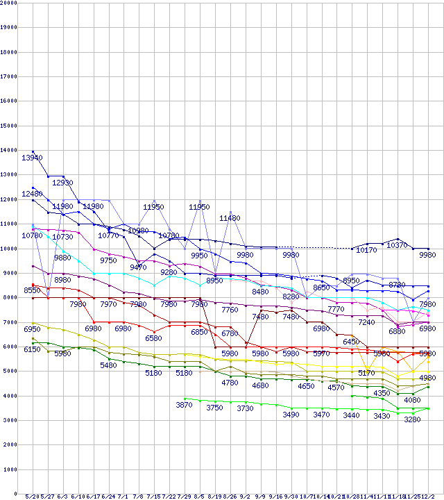 HDD/SSD主要製品(最安値1万円未満)の最安値推移↑前グラフ↓次グラフ(2010年5月20日〜2010年12月2日)※このグラフは過去のデータも税率5%相当に調整した税込み相当額のグラフです。凡例HDS722020ALA330 (2TB,32MB)WD10TPVT (1TB,8MB,12.5mm厚)ST32000542AS (2TB,32MB)その他2.5インチSSD 64GB (64GB,MLC)WD20EARS (2TB,64MB)HD204UI (2TB,32MB)HTS547575A9E384 (750GB,8MB)WD7500BPVT (750GB,8MB)WD1002FAEX (1TB,64MB)その他2.5インチSSD 32GB (32GB,MLC)WD6400BPVT (640GB,8MB)WD15EARS (1.5TB,64MB)HTS547564A9E384 (640GB,8MB)WD10EALX (1TB,32MB)WD5000AALX (500GB,32MB)0S02601(純正パッケージ品) (1TB,32MB)ST31000528AS (1TB,32MB)WD10EARS (1TB,64MB)0S02598 (500GB,8MB)WD5000BEVT (500GB,8MB)WD5000AAKX (500GB)0S02600(純正パッケージ品) (500GB,16MB)※製品名をクリックすると個別のグラフを表示します※点線部は販売店が確認できなかった、または調査データがないことを示します