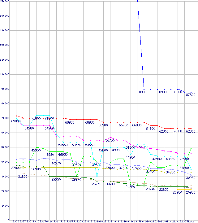 HDD/SSD主要製品(最安値2万円以上)の最安値推移↑前グラフ↓次グラフ(2010年5月20日〜2010年12月2日)※このグラフは過去のデータも税率5%相当に調整した税込み相当額のグラフです。凡例その他2.5インチSSD 512GB (512GB,MLC)SSDSA2SH064G1C5 (64GB,SLC)その他2.5インチSSD 256GB (256GB,MLC)CTFDDAC256MAG-1G1 (256GB,MLC)2.5インチSSD(SandForce製コントローラ) (200〜240GB,MLC)SSDSA2SH032G1 (32GB,SLC)X25-M(G2) (160GB,MLC)WD6000HLHX (600.0GB)CTFDDAC128MAG-1G1 (128GB,MLC)WD30EZRSDTL (3TB,64MB,SATAカード付属)WD30EZRS (3TB,64MB)HDS723030ALA640 (3TB,64MB)※製品名をクリックすると個別のグラフを表示します※点線部は販売店が確認できなかった、または調査データがないことを示します