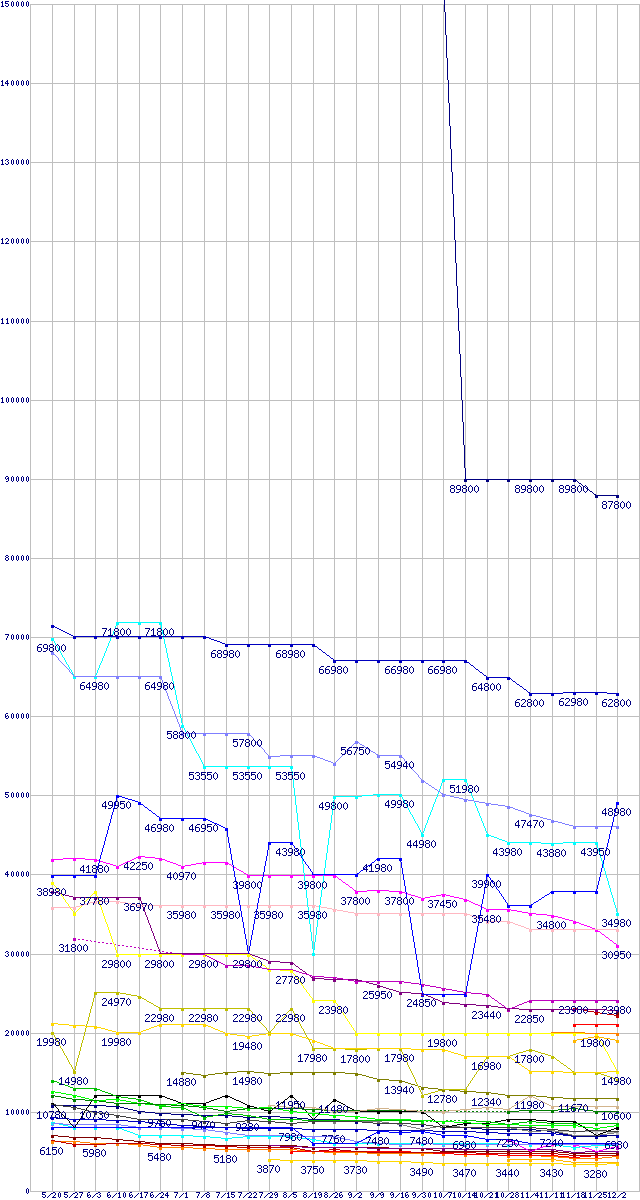 HDD/SSD主要製品の最安値推移↑前グラフ↓次グラフ(2010年5月20日〜2010年12月2日)※このグラフは過去のデータも税率5%相当に調整した税込み相当額のグラフです。凡例その他2.5インチSSD 512GB (512GB,MLC)SSDSA2SH064G1C5 (64GB,SLC)その他2.5インチSSD 256GB (256GB,MLC)CTFDDAC256MAG-1G1 (256GB,MLC)2.5インチSSD(SandForce製コントローラ) (200〜240GB,MLC)SSDSA2SH032G1 (32GB,SLC)X25-M(G2) (160GB,MLC)WD6000HLHX (600.0GB)CTFDDAC128MAG-1G1 (128GB,MLC)WD30EZRSDTL (3TB,64MB,SATAカード付属)WD30EZRS (3TB,64MB)HDS723030ALA640 (3TB,64MB)X25-M(G2) (120GB,MLC)WD25EZRS (2.5TB,64MB)X25-M(G2) (80GB,MLC)2.5インチSSD(SandForce製コントローラ) (100〜120GB,MLC)その他2.5インチSSD 128GB (128GB,MLC)CTFDDAC064MAG-1G1 (64GB,MLC)0S02602(純正パッケージ品) (2TB,32MB)HDS722020ALA330 (2TB,32MB)WD10TPVT (1TB,8MB,12.5mm厚)ST32000542AS (2TB,32MB)その他2.5インチSSD 64GB (64GB,MLC)WD20EARS (2TB,64MB)HD204UI (2TB,32MB)HTS547575A9E384 (750GB,8MB)WD7500BPVT (750GB,8MB)WD1002FAEX (1TB,64MB)その他2.5インチSSD 32GB (32GB,MLC)WD6400BPVT (640GB,8MB)WD15EARS (1.5TB,64MB)HTS547564A9E384 (640GB,8MB)WD10EALX (1TB,32MB)WD5000AALX (500GB,32MB)0S02601(純正パッケージ品) (1TB,32MB)ST31000528AS (1TB,32MB)WD10EARS (1TB,64MB)0S02598 (500GB,8MB)WD5000BEVT (500GB,8MB)WD5000AAKX (500GB)0S02600(純正パッケージ品) (500GB,16MB)※製品名をクリックすると個別のグラフを表示します※点線部は販売店が確認できなかった、または調査データがないことを示します