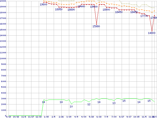 Core i5-660 (3.33GHz)の価格推移↑前グラフ↓次グラフ(2009年9月18日〜2010年12月3日)※このグラフは過去のデータも税率5%相当に調整した税込み相当額のグラフです。●関連グラフCPU主要製品の最安値推移CPU主要製品(最安値1万円〜2万円未満)の最安値推移Intel系CPUの最安値推移LGA1156 (L3キャッシュ4MB,Dual Core,GPU内蔵,Hyper-Threading,TDP 73〜87W)の最安値推移●凡例最安値(点線部は販売店未確認または未調査)平均値最高値ショップ数