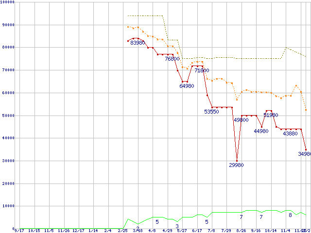 2.5インチSSD(SandForce製コントローラ) (200〜240GB,MLC)の価格推移↑前グラフ↓次グラフ(2009年9月17日〜2010年12月2日)※このグラフは過去のデータも税率5%相当に調整した税込み相当額のグラフです。●関連グラフHDD/SSD主要製品の最安値推移HDD/SSD主要製品(最安値2万円以上)の最安値推移HDD 200〜250GB未満の最安値推移2.5インチSSD (SSD,3Gbps,2.5インチ)の最安値推移SandForce製コントローラ搭載SSD●凡例最安値(点線部は販売店未確認または未調査)平均値最高値ショップ数