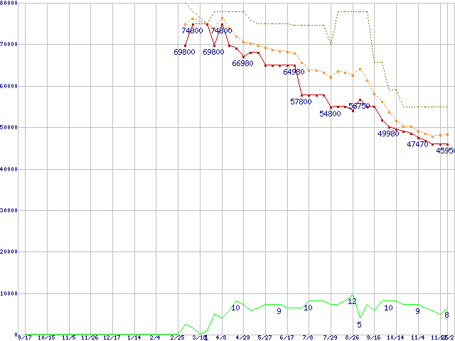 CTFDDAC256MAG-1G1 (256GB,MLC)の価格推移↑前グラフ↓次グラフ(2009年9月17日〜2010年12月2日)※このグラフは過去のデータも税率5%相当に調整した税込み相当額のグラフです。●関連グラフHDD/SSD主要製品の最安値推移HDD/SSD主要製品(最安値2万円以上)の最安値推移HDD 250〜300GB未満の最安値推移RealSSD C300 (SSD,6Gbps,2.5インチ,リード355MB/s・ライト70〜215MB/s)の最安値推移●凡例最安値(点線部は販売店未確認または未調査)平均値最高値ショップ数