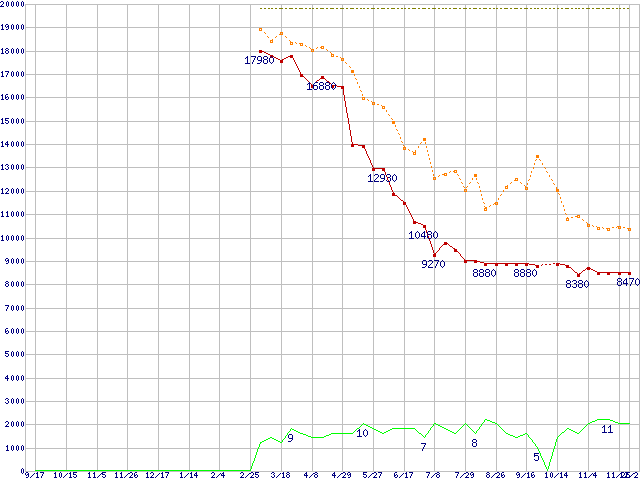WD10TPVT (1TB,8MB,12.5mm厚)の価格推移↑前グラフ(2009年9月17日〜2010年12月2日)※このグラフは過去のデータも税率5%相当に調整した税込み相当額のグラフです。●関連グラフHDD/SSD主要製品の最安値推移HDD/SSD主要製品(最安値1万円未満)の最安値推移HDD 1TB〜1.5TB未満の最安値推移WD Scorpio Blue (5200〜5400rpm,3Gb/s,2.5インチ)の最安値推移●凡例最安値(点線部は販売店未確認または未調査)平均値最高値ショップ数