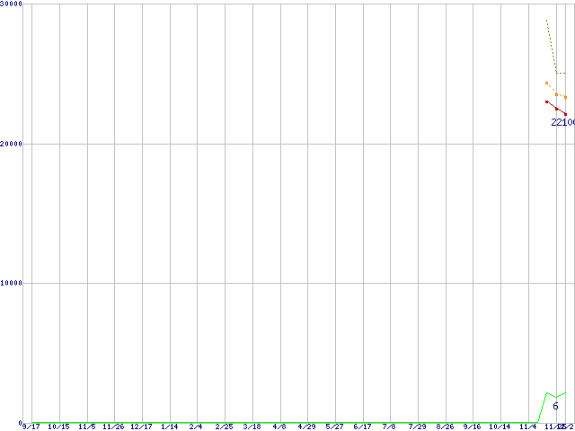 WD30EZRS (3TB,64MB)の価格推移↑前グラフ↓次グラフ(2009年9月17日〜2010年12月2日)※このグラフは過去のデータも税率5%相当に調整した税込み相当額のグラフです。●関連グラフHDD/SSD主要製品の最安値推移HDD/SSD主要製品(最安値2万円以上)の最安値推移HDD 2TB以上の最安値推移WD Caviar Green (3Gb/s)の最安値推移●凡例最安値(点線部は販売店未確認または未調査)平均値最高値ショップ数