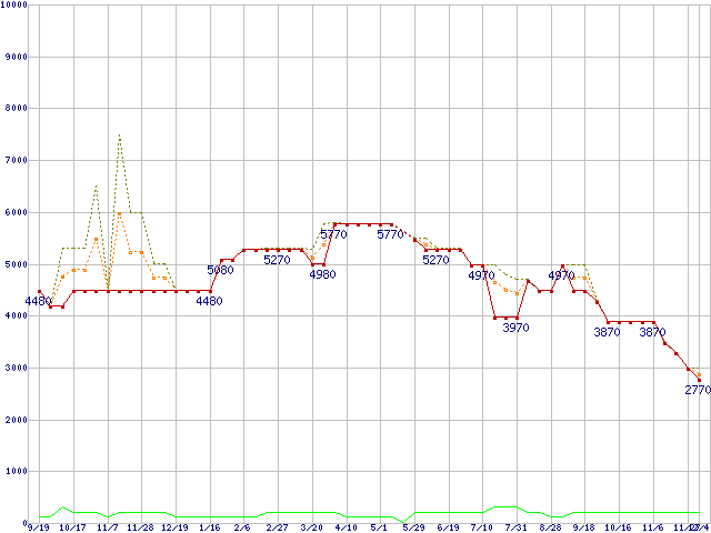 PC3-12800 2GBの価格推移↑前グラフ↓次グラフ(2009年9月19日〜2010年12月4日)※このグラフは過去のデータも税率5%相当に調整した税込み相当額のグラフです。●関連グラフメモリ主要製品の最安値推移2GBモジュール/1GBモジュール×2枚の最安値推移メモリ主要製品(最安値5千円未満)の最安値推移PC3-12800(DDR3-1600) DDR3 SDRAM DIMMの最安値推移●凡例最安値(点線部は販売店未確認または未調査)平均値最高値ショップ数