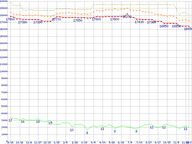 Core 2 Duo E8500 (3.16GHz,L2 6MB)の価格推移↑前グラフ↓次グラフ(2009年9月18日〜2010年12月3日)※このグラフは過去のデータも税率5%相当に調整した税込み相当額のグラフです。●関連グラフCPU主要製品の最安値推移CPU主要製品(最安値1万円〜2万円未満)の最安値推移Intel系CPUの最安値推移LGA775 (FSB 1333MHz,Dual Core,TDP 65W)の最安値推移●凡例最安値(点線部は販売店未確認または未調査)平均値最高値ショップ数