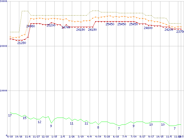 Core 2 Quad Q9550 (2.83GHz,L2 6MB×2)の価格推移↑前グラフ↓次グラフ(2009年9月18日〜2010年12月3日)※このグラフは過去のデータも税率5%相当に調整した税込み相当額のグラフです。●関連グラフCPU主要製品の最安値推移CPU主要製品(最安値2万円〜3万円未満)の最安値推移Intel系CPUの最安値推移LGA775 (FSB 1333MHz,Quad Core,TDP 95W)の最安値推移●凡例最安値(点線部は販売店未確認または未調査)平均値最高値ショップ数