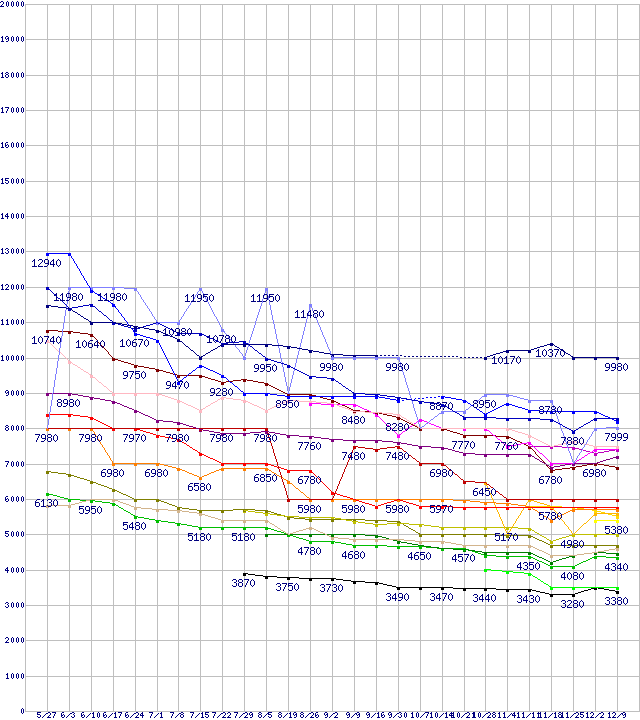 HDD/SSD主要製品(最安値1万円未満)の最安値推移↑前グラフ↓次グラフ(2010年5月27日〜2010年12月9日)※このグラフは過去のデータも税率5%相当に調整した税込み相当額のグラフです。凡例HDS722020ALA330 (2TB,32MB)ST32000542AS (2TB,32MB)WD10TPVT (1TB,8MB,12.5mm厚)その他2.5インチSSD 64GB (64GB,MLC)0S03085 (750GB,8MB)WD20EARS (2TB,64MB)HD204UI (2TB,32MB)HTS547575A9E384 (750GB,8MB)WD1002FAEX (1TB,64MB)WD7500BPVT (750GB,8MB)その他2.5インチSSD 32GB (32GB,MLC)WD6400BPVT (640GB,8MB)WD15EARS (1.5TB,64MB)WD10EALX (1TB,32MB)HTS547564A9E384 (640GB,8MB)WD5000AALX (500GB,32MB)0S02601(純正パッケージ品) (1TB,32MB)ST31000528AS (1TB,32MB)WD10EARS (1TB,64MB)0S02598 (500GB,8MB)WD5000BEVT (500GB,8MB)WD5000AAKX (500GB)0S02600(純正パッケージ品) (500GB,16MB)※製品名をクリックすると個別のグラフを表示します※点線部は販売店が確認できなかった、または調査データがないことを示します