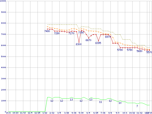 Athlon II X2 255 (3.1GHz,L2 1MB×2,TDP 65W)の価格推移↑前グラフ↓次グラフ(2009年10月2日〜2010年12月10日)※このグラフは過去のデータも税率5%相当に調整した税込み相当額のグラフです。●関連グラフCPU主要製品の最安値推移CPU主要製品(最安値1万円未満)の最安値推移AMD系CPUの最安値推移Socket AM3 (Dual Core)の最安値推移●凡例最安値(点線部は販売店未確認または未調査)平均値最高値ショップ数