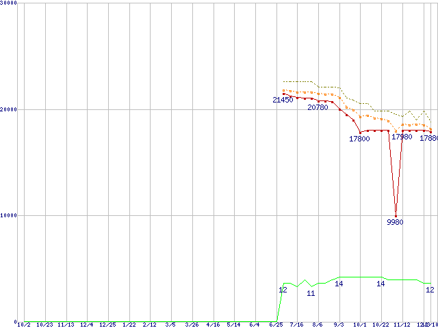 Phenom II X6 1055T (2.8GHz,L2 512KB×6,L3 6MB,TDP 95W)の価格推移↑前グラフ↓次グラフ(2009年10月2日〜2010年12月10日)※このグラフは過去のデータも税率5%相当に調整した税込み相当額のグラフです。●関連グラフCPU主要製品の最安値推移CPU主要製品(最安値1万円〜2万円未満)の最安値推移AMD系CPUの最安値推移Socket AM3 (HyperTransport 3.0,6Core)の最安値推移●凡例最安値(点線部は販売店未確認または未調査)平均値最高値ショップ数