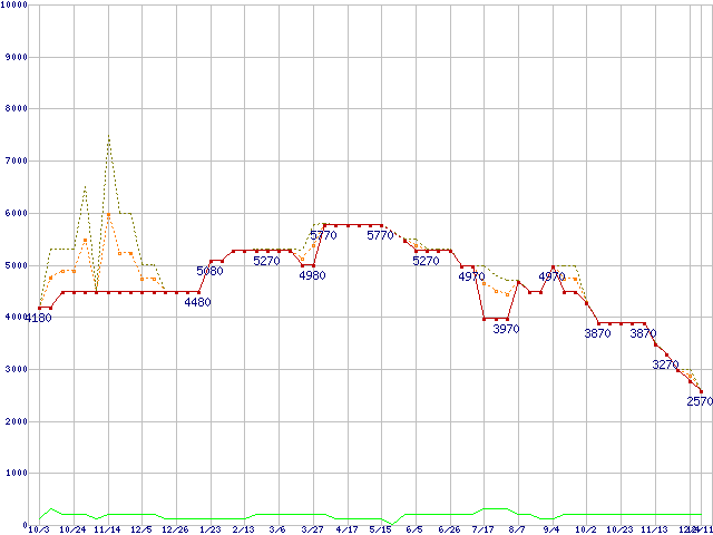 PC3-12800 2GBの価格推移↑前グラフ↓次グラフ(2009年10月3日〜2010年12月11日)※このグラフは過去のデータも税率5%相当に調整した税込み相当額のグラフです。●関連グラフメモリ主要製品の最安値推移2GBモジュール/1GBモジュール×2枚の最安値推移メモリ主要製品(最安値5千円未満)の最安値推移PC3-12800(DDR3-1600) DDR3 SDRAM DIMMの最安値推移●凡例最安値(点線部は販売店未確認または未調査)平均値最高値ショップ数