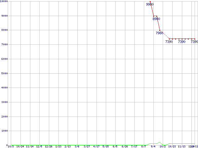 PC3-12800 4GBの価格推移↑前グラフ↓次グラフ(2009年10月3日〜2010年12月11日)※このグラフは過去のデータも税率5%相当に調整した税込み相当額のグラフです。●関連グラフメモリ主要製品の最安値推移4GBモジュール/2GBモジュール×2枚の最安値推移メモリ主要製品(最安値5千円〜1万円未満)の最安値推移PC3-12800(DDR3-1600) DDR3 SDRAM DIMMの最安値推移●凡例最安値(点線部は販売店未確認または未調査)平均値最高値ショップ数