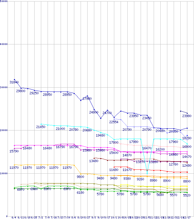 AMD系CPUの最安値推移↑前グラフ↓次グラフ(2010年6月4日〜2010年12月17日)※このグラフは過去のデータも税率5%相当に調整した税込み相当額のグラフです。凡例Phenom II X6 1100T Black Edition (3.3GHz,L2 512KB×6,L3 6MB,TDP 125W)Phenom II X6 1090T Black Edition (3.2GHz,L2 512KB×6,L3 6MB,TDP 125W)Phenom II X6 1065T (2.9GHz,L2 512KB×6,L3 6MB,TDP 95W)Phenom II X6 1075T (3.0GHz,L2 512KB×6,L3 6MB,TDP 125W)Phenom II X6 1055T (2.8GHz,L2 512KB×6,L3 6MB,TDP 95W)Phenom II X4 970 Black Edition (3.5GHz,L2 512KB×4,L3 6MB,TDP 125W)Phenom II X4 910e (2.6GHz,L2 512KB×4,L3 6MB,TDP 65W)Phenom II X4 965 Black Edition (3.4GHz,L2 512KB×4,L3 6MB,TDP 125W)Athlon II X4 615e (2.5GHz,L2 512KB×4,TDP 45W)Phenom II X4 955 (3.2GHz,L2 512KB×4,L3 6MB,TDP 95W)Phenom II X2 565 Black Edition (3.4GHz,L2 512KB×2,L3 6MB)Athlon II X4 645 (3.1GHz,L2 512KB×4,TDP 95W)Phenom II X2 560 Black Edition (3.3GHz,L2 512KB×2,L3 6MB)Athlon II X4 640 (3.0GHz,L2 512KB×4,TDP 95W)Athlon II X3 450 (3.2GHz,L2 512KB×3,TDP 95W)Athlon II X2 250e (3.0GHz,L2 1MB×2,TDP 45W)Athlon II X2 265 (3.3GHz,L2 1MB×2,TDP 65W)Athlon II X2 245e (2.9GHz,L2 1MB×2,TDP 45W)Athlon II X2 260 (3.2GHz,L2 1MB×2,TDP 65W)Athlon II X2 240e (2.8GHz,L2 1MB×2,TDP 45W)Athlon II X2 255 (3.1GHz,L2 1MB×2,TDP 65W)※製品名をクリックすると個別のグラフを表示します※点線部は販売店が確認できなかった、または調査データがないことを示します