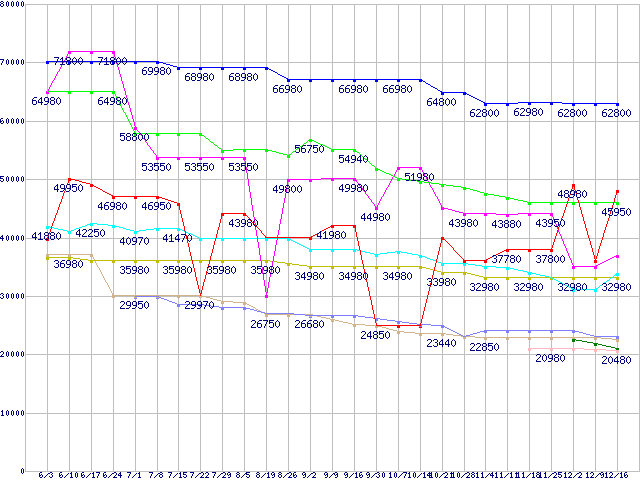 HDD/SSD主要製品(最安値2万円以上)の最安値推移↑前グラフ(2010年6月3日〜2010年12月16日)※このグラフは過去のデータも税率5%相当に調整した税込み相当額のグラフです。凡例SSDSA2SH064G1C5 (64GB,SLC)その他2.5インチSSD 256GB (256GB,MLC)CTFDDAC256MAG-1G1 (256GB,MLC)2.5インチSSD(SandForce製コントローラ) (200〜240GB,MLC)X25-M(G2) (160GB,MLC)SSDSA2SH032G1 (32GB,SLC)WD6000HLHX (600.0GB)CTFDDAC128MAG-1G1 (128GB,MLC)WD30EZRSDTL (3TB,64MB,SATAカード付属)HDS723030ALA640 (3TB,64MB)※製品名をクリックすると個別のグラフを表示します※点線部は販売店が確認できなかった、または調査データがないことを示します