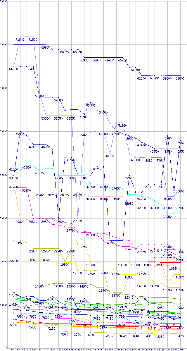 HDD/SSD主要製品の最安値推移↑前グラフ↓次グラフ(2010年6月3日〜2010年12月16日)※このグラフは過去のデータも税率5%相当に調整した税込み相当額のグラフです。凡例SSDSA2SH064G1C5 (64GB,SLC)その他2.5インチSSD 256GB (256GB,MLC)CTFDDAC256MAG-1G1 (256GB,MLC)2.5インチSSD(SandForce製コントローラ) (200〜240GB,MLC)X25-M(G2) (160GB,MLC)SSDSA2SH032G1 (32GB,SLC)WD6000HLHX (600.0GB)CTFDDAC128MAG-1G1 (128GB,MLC)WD30EZRSDTL (3TB,64MB,SATAカード付属)HDS723030ALA640 (3TB,64MB)WD30EZRS (3TB,64MB)X25-M(G2) (120GB,MLC)WD25EZRS (2.5TB,64MB)2.5インチSSD(SandForce製コントローラ) (100〜120GB,MLC)WD2002FAEX (2TB,64MB)X25-M(G2) (80GB,MLC)その他2.5インチSSD 128GB (128GB,MLC)CTFDDAC064MAG-1G1 (64GB,MLC)ST2000DL003 (2TB,64MB)0S02602(純正パッケージ品) (2TB,32MB)HDS722020ALA330 (2TB,32MB)ST32000542AS (2TB,32MB)WD10TPVT (1TB,8MB,12.5mm厚)0S03085 (750GB,8MB)WD20EARS (2TB,64MB)HD204UI (2TB,32MB)WD1002FAEX (1TB,64MB)その他2.5インチSSD 64GB (64GB,MLC)HTS547575A9E384 (750GB,8MB)WD7500BPVT (750GB,8MB)その他2.5インチSSD 32GB (32GB,MLC)WD6400BPVT (640GB,8MB)WD15EARS (1.5TB,64MB)HTS547564A9E384 (640GB,8MB)WD10EALX (1TB,32MB)WD5000AALX (500GB,32MB)0S02601(純正パッケージ品) (1TB,32MB)ST31000528AS (1TB,32MB)WD10EARS (1TB,64MB)0S02598 (500GB,8MB)WD5000BEVT (500GB,8MB)WD5000AAKX (500GB)0S02600(純正パッケージ品) (500GB,16MB)※製品名をクリックすると個別のグラフを表示します※点線部は販売店が確認できなかった、または調査データがないことを示します