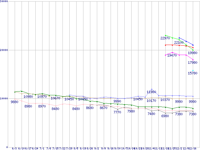 HDD 2TB以上の最安値推移↑前グラフ↓次グラフ(2010年6月3日〜2010年12月16日)※このグラフは過去のデータも税率5%相当に調整した税込み相当額のグラフです。凡例WD30EZRSDTL (3TB,64MB,SATAカード付属)HDS723030ALA640 (3TB,64MB)WD30EZRS (3TB,64MB)WD25EZRS (2.5TB,64MB)WD2002FAEX (2TB,64MB)ST2000DL003 (2TB,64MB)0S02602(純正パッケージ品) (2TB,32MB)HDS722020ALA330 (2TB,32MB)ST32000542AS (2TB,32MB)WD20EARS (2TB,64MB)HD204UI (2TB,32MB)※製品名をクリックすると個別のグラフを表示します※点線部は販売店が確認できなかった、または調査データがないことを示します