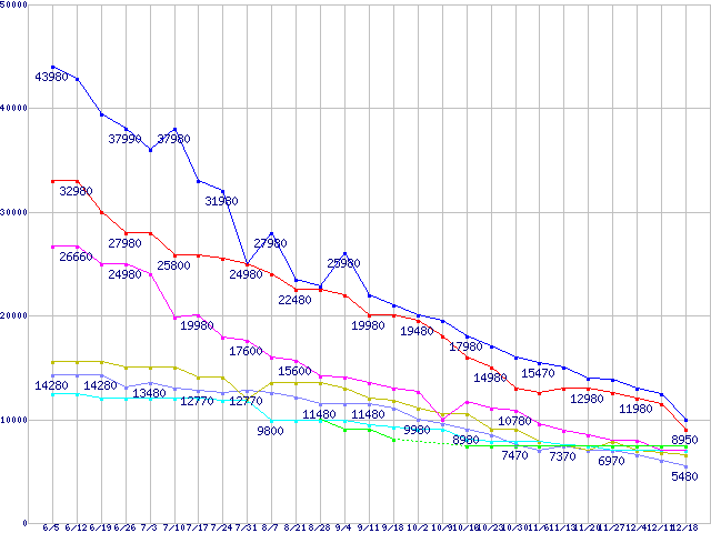 | メモリ主要製品(最安値5千円〜1万円未満)の最安値推移 |