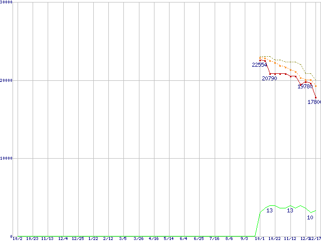 Phenom II X6 1075T (3.0GHz,L2 512KB×6,L3 6MB,TDP 125W)の価格推移↑前グラフ↓次グラフ(2009年10月2日〜2010年12月17日)※このグラフは過去のデータも税率5%相当に調整した税込み相当額のグラフです。●関連グラフCPU主要製品の最安値推移CPU主要製品(最安値1万円〜2万円未満)の最安値推移AMD系CPUの最安値推移Socket AM3 (HyperTransport 3.0,6Core)の最安値推移●凡例最安値(点線部は販売店未確認または未調査)平均値最高値ショップ数