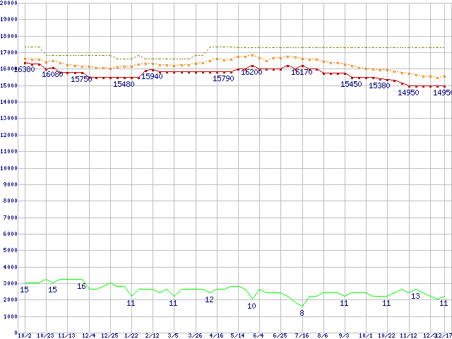 Core 2 Duo E8400 (3GHz,L2 6MB)の価格推移↑前グラフ↓次グラフ(2009年10月2日〜2010年12月17日)※このグラフは過去のデータも税率5%相当に調整した税込み相当額のグラフです。●関連グラフCPU主要製品の最安値推移CPU主要製品(最安値1万円〜2万円未満)の最安値推移Intel系CPUの最安値推移LGA775 (FSB 1333MHz,Dual Core,TDP 65W)の最安値推移●凡例最安値(点線部は販売店未確認または未調査)平均値最高値ショップ数