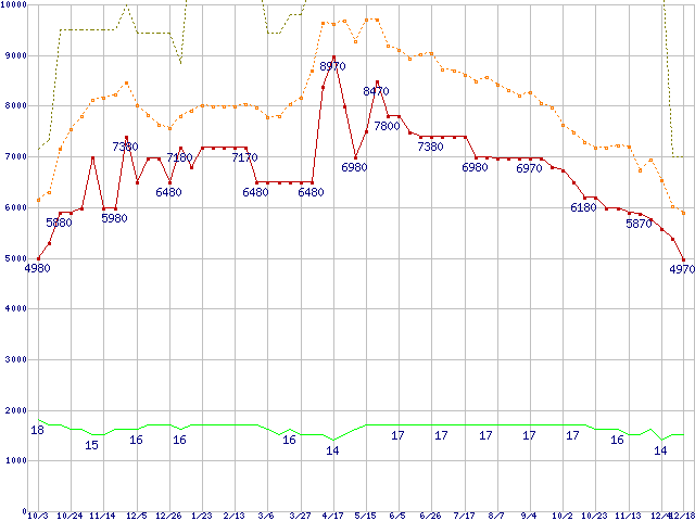 PC2-6400 2GB×2枚組みセットの価格推移↑前グラフ↓次グラフ(2009年10月3日〜2010年12月18日)※このグラフは過去のデータも税率5%相当に調整した税込み相当額のグラフです。●関連グラフメモリ主要製品の最安値推移4GBモジュール/2GBモジュール×2枚の最安値推移メモリ主要製品(最安値5千円未満)の最安値推移PC2-6400(DDR2-800) DDR2 SDRAM DIMMの最安値推移●凡例最安値(点線部は販売店未確認または未調査)平均値最高値ショップ数