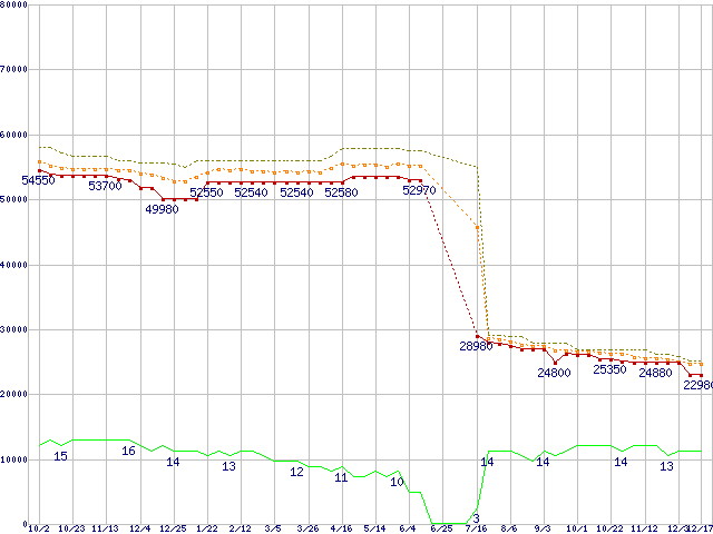 Core i7-870 (2.93GHz)の価格推移↑前グラフ↓次グラフ(2009年10月2日〜2010年12月17日)※このグラフは過去のデータも税率5%相当に調整した税込み相当額のグラフです。●関連グラフCPU主要製品の最安値推移CPU主要製品(最安値2万円〜3万円未満)の最安値推移Intel系CPUの最安値推移LGA1156 (L3キャッシュ8MB,Quad Core,Hyper-Threading,TDP 82〜95W)の最安値推移●凡例最安値(点線部は販売店未確認または未調査)平均値最高値ショップ数