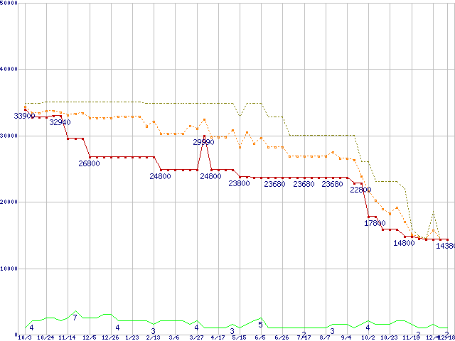 PC2-6400 4GB×2枚組みセットの価格推移↑前グラフ↓次グラフ(2009年10月3日〜2010年12月18日)※このグラフは過去のデータも税率5%相当に調整した税込み相当額のグラフです。●関連グラフメモリ主要製品の最安値推移メモリ主要製品(最安値1万円以上)の最安値推移PC2-6400(DDR2-800) DDR2 SDRAM DIMMの最安値推移●凡例最安値(点線部は販売店未確認または未調査)平均値最高値ショップ数