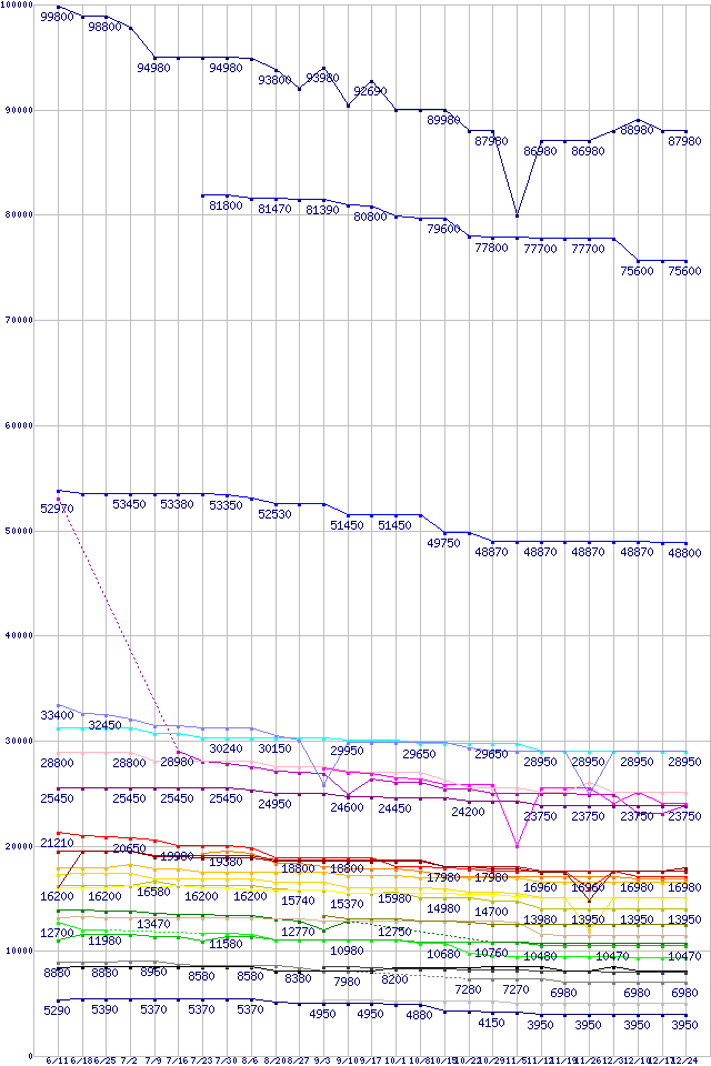 Intel系CPUの最安値推移↑前グラフ↓次グラフ(2010年6月11日〜2010年12月24日)※このグラフは過去のデータも税率5%相当に調整した税込み相当額のグラフです。凡例Core i7-980X Extreme Edition (3.33GHz)Core i7-970 (3.2GHz)Core i7-960 (3.20GHz)Core i7-875K (2.93GHz)Core 2 Quad Q9650 (3.00GHz,L2 6MB×2)Core i5-680 (3.6GHz)Core i7-950 (3.06GHz)Core i7-870 (2.93GHz)Core 2 Quad Q9550 (2.83GHz,L2 6MB×2)Core i5-660 (3.33GHz)Core i5-661 (3.33GHz)Core i5-655K (3.2GHz)Core i5-760 (2.8GHz)Core 2 Duo E8500 (3.16GHz,L2 6MB)Core i5-650 (3.2GHz)Core 2 Duo E8400 (3GHz,L2 6MB)Core 2 Quad Q8400 (2.66GHz,L2 2MB×2)Core i3-560 (3.33GHz)Core 2 Duo E7600 (3.06GHz,L2 3MB)Core i3-550 (3.20GHz)Core 2 Duo E7500 (2.93GHz,L2 3MB)Core i3-540 (3.06GHz)Pentium G6950 (2.8GHz)Pentium E6800 (3.33GHz,L2 2MB)Pentium E6700 (3.20GHz,L2 2MB)Celeron E3500 (2.7GHz)Celeron E3400 (2.6GHz)※製品名をクリックすると個別のグラフを表示します※点線部は販売店が確認できなかった、または調査データがないことを示します
