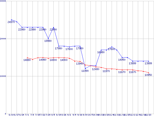 | HDD/SSD主要製品(最安値1万円〜1万5千円未満)の最安値推移 |