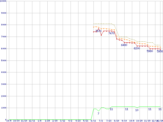 Athlon II X2 260 (3.2GHz,L2 1MB×2,TDP 65W)の価格推移↑前グラフ↓次グラフ(2009年10月9日〜2010年12月24日)※このグラフは過去のデータも税率5%相当に調整した税込み相当額のグラフです。●関連グラフCPU主要製品の最安値推移CPU主要製品(最安値1万円未満)の最安値推移AMD系CPUの最安値推移Socket AM3 (Dual Core)の最安値推移●凡例最安値(点線部は販売店未確認または未調査)平均値最高値ショップ数