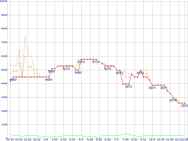 PC3-12800 2GBの価格推移↑前グラフ↓次グラフ(2009年10月10日〜2010年12月25日)※このグラフは過去のデータも税率5%相当に調整した税込み相当額のグラフです。●関連グラフメモリ主要製品の最安値推移2GBモジュール/1GBモジュール×2枚の最安値推移メモリ主要製品(最安値5千円未満)の最安値推移PC3-12800(DDR3-1600) DDR3 SDRAM DIMMの最安値推移●凡例最安値(点線部は販売店未確認または未調査)平均値最高値ショップ数