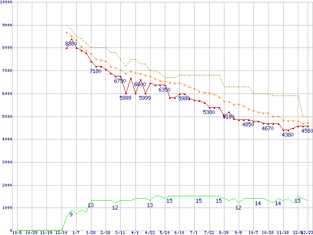 WD10EARS (1TB,64MB)の価格推移↑前グラフ↓次グラフ(2009年10月8日〜2010年12月23日)※このグラフは過去のデータも税率5%相当に調整した税込み相当額のグラフです。●関連グラフHDD/SSD主要製品の最安値推移HDD/SSD主要製品(最安値1万円未満)の最安値推移HDD 1TB〜1.5TB未満の最安値推移WD Caviar Green (3Gb/s)の最安値推移●凡例最安値(点線部は販売店未確認または未調査)平均値最高値ショップ数