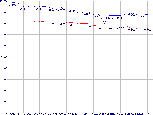 | CPU主要製品(最安値6万円以上)の最安値推移 |