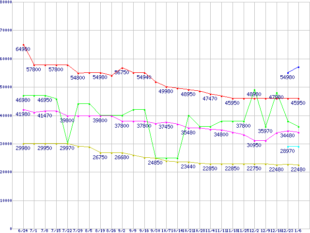 | HDD/SSD主要製品(最安値2万円以上)の最安値推移 |