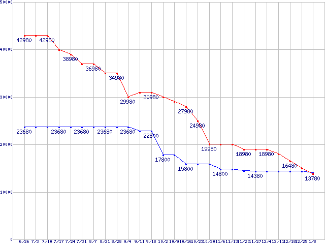 | メモリ主要製品(最安値1万円以上)の最安値推移 |