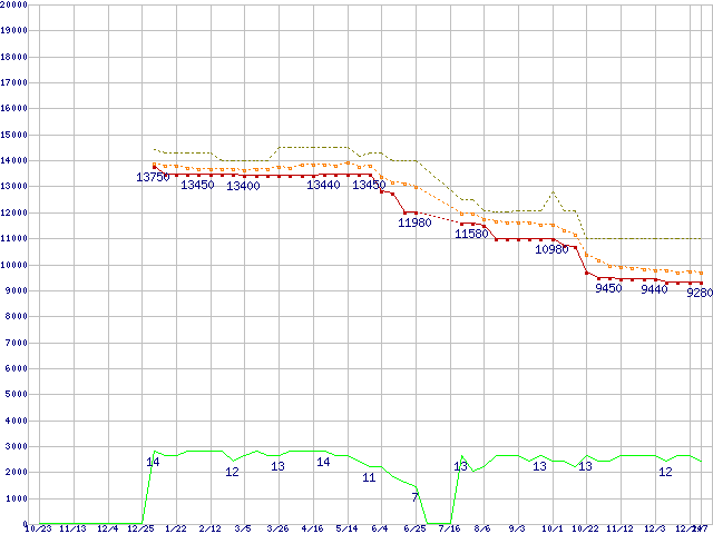Core i3-540 (3.06GHz)の価格推移↑前グラフ↓次グラフ(2009年10月23日〜2011年1月7日)※このグラフは過去のデータも税率5%相当に調整した税込み相当額のグラフです。●関連グラフCPU主要製品の最安値推移CPU主要製品(最安値1万円未満)の最安値推移Intel系CPUの最安値推移LGA1156 (L3キャッシュ4MB,Dual Core,GPU内蔵,Hyper-Threading,TDP 73〜87W)の最安値推移●凡例最安値(点線部は販売店未確認または未調査)平均値最高値ショップ数