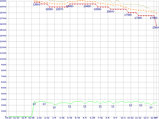 Core i5-661 (3.33GHz)の価格推移↑前グラフ↓次グラフ(2009年10月23日〜2011年1月7日)※このグラフは過去のデータも税率5%相当に調整した税込み相当額のグラフです。●関連グラフCPU主要製品の最安値推移CPU主要製品(最安値1万円〜2万円未満)の最安値推移Intel系CPUの最安値推移LGA1156 (L3キャッシュ4MB,Dual Core,GPU内蔵,Hyper-Threading,TDP 73〜87W)の最安値推移Core i5-600シリーズの最安値推移●凡例最安値(点線部は販売店未確認または未調査)平均値最高値ショップ数