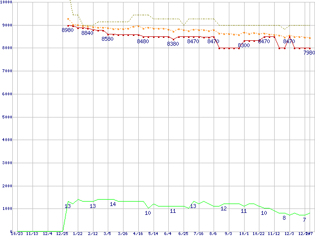Pentium G6950 (2.8GHz)の価格推移↑前グラフ↓次グラフ(2009年10月23日〜2011年1月7日)※このグラフは過去のデータも税率5%相当に調整した税込み相当額のグラフです。●関連グラフCPU主要製品の最安値推移CPU主要製品(最安値1万円未満)の最安値推移Intel系CPUの最安値推移LGA1156 (L3キャッシュ3MB,Dual Core,GPU内蔵,TDP 73W)の最安値推移●凡例最安値(点線部は販売店未確認または未調査)平均値最高値ショップ数