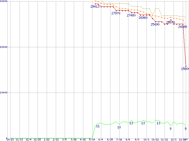 Core i5-680 (3.6GHz)の価格推移↑前グラフ↓次グラフ(2009年10月23日〜2011年1月7日)※このグラフは過去のデータも税率5%相当に調整した税込み相当額のグラフです。●関連グラフCPU主要製品の最安値推移CPU主要製品(最安値1万円〜2万円未満)の最安値推移Intel系CPUの最安値推移LGA1156 (L3キャッシュ4MB,Dual Core,GPU内蔵,Hyper-Threading,TDP 73〜87W)の最安値推移Core i5-600シリーズの最安値推移●凡例最安値(点線部は販売店未確認または未調査)平均値最高値ショップ数