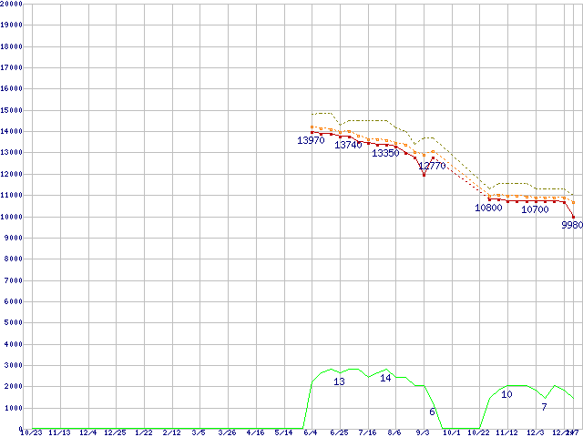 Core i3-550 (3.20GHz)の価格推移↑前グラフ↓次グラフ(2009年10月23日〜2011年1月7日)※このグラフは過去のデータも税率5%相当に調整した税込み相当額のグラフです。●関連グラフCPU主要製品の最安値推移CPU主要製品(最安値1万円未満)の最安値推移Intel系CPUの最安値推移LGA1156 (L3キャッシュ4MB,Dual Core,GPU内蔵,Hyper-Threading,TDP 73〜87W)の最安値推移●凡例最安値(点線部は販売店未確認または未調査)平均値最高値ショップ数