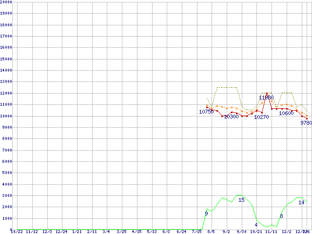 0S02602(純正パッケージ品) (2TB,32MB)の価格推移↓次グラフ(2009年10月22日〜2011年1月6日)※このグラフは過去のデータも税率5%相当に調整した税込み相当額のグラフです。●関連グラフHDD/SSD主要製品の最安値推移HDD/SSD主要製品(最安値1万円未満)の最安値推移HDD 2TB以上の最安値推移DESKSTAR (7200rpm,3Gb/s)の最安値推移●凡例最安値(点線部は販売店未確認または未調査)平均値最高値ショップ数