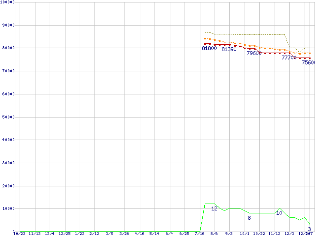 Core i7-970 (3.2GHz)の価格推移↑前グラフ↓次グラフ(2009年10月23日〜2011年1月7日)※このグラフは過去のデータも税率5%相当に調整した税込み相当額のグラフです。●関連グラフCPU主要製品の最安値推移CPU主要製品(最安値6万円以上)の最安値推移Intel系CPUの最安値推移LGA1366 (QPI 4.8GT/s,L3キャッシュ12MB,6Core,Hyper-Threading,TDP 130W)の最安値推移●凡例最安値(点線部は販売店未確認または未調査)平均値最高値ショップ数