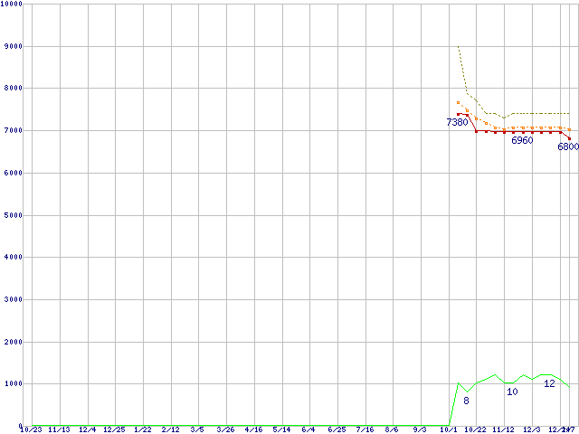 Athlon II X2 250e (3.0GHz,L2 1MB×2,TDP 45W)の価格推移↑前グラフ↓次グラフ(2009年10月23日〜2011年1月7日)※このグラフは過去のデータも税率5%相当に調整した税込み相当額のグラフです。●関連グラフCPU主要製品の最安値推移CPU主要製品(最安値1万円未満)の最安値推移AMD系CPUの最安値推移Socket AM3 (Dual Core)の最安値推移●凡例最安値(点線部は販売店未確認または未調査)平均値最高値ショップ数