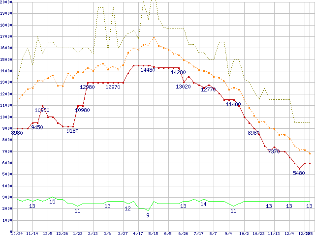PC3-10600 2GB×3枚組みセットの価格推移↑前グラフ↓次グラフ(2009年10月24日〜2011年1月8日)※このグラフは過去のデータも税率5%相当に調整した税込み相当額のグラフです。●関連グラフメモリ主要製品の最安値推移メモリ主要製品(最安値5千円〜1万円未満)の最安値推移PC3-10600(DDR3-1333) DDR3 SDRAM DIMMの最安値推移●凡例最安値(点線部は販売店未確認または未調査)平均値最高値ショップ数