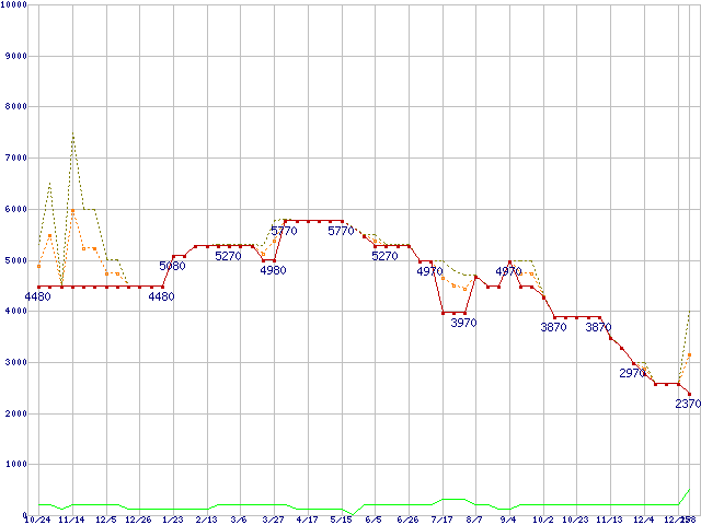PC3-12800 2GBの価格推移↑前グラフ↓次グラフ(2009年10月24日〜2011年1月8日)※このグラフは過去のデータも税率5%相当に調整した税込み相当額のグラフです。●関連グラフメモリ主要製品の最安値推移2GBモジュール/1GBモジュール×2枚の最安値推移メモリ主要製品(最安値5千円未満)の最安値推移PC3-12800(DDR3-1600) DDR3 SDRAM DIMMの最安値推移●凡例最安値(点線部は販売店未確認または未調査)平均値最高値ショップ数