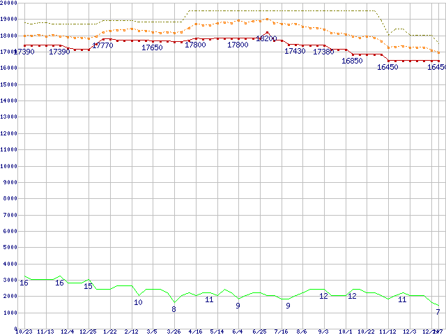 Core 2 Duo E8500 (3.16GHz,L2 6MB)の価格推移↑前グラフ↓次グラフ(2009年10月23日〜2011年1月7日)※このグラフは過去のデータも税率5%相当に調整した税込み相当額のグラフです。●関連グラフCPU主要製品の最安値推移CPU主要製品(最安値1万円〜2万円未満)の最安値推移Intel系CPUの最安値推移LGA775 (FSB 1333MHz,Dual Core,TDP 65W)の最安値推移●凡例最安値(点線部は販売店未確認または未調査)平均値最高値ショップ数