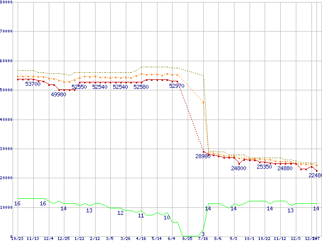 Core i7-870 (2.93GHz)の価格推移↑前グラフ↓次グラフ(2009年10月23日〜2011年1月7日)※このグラフは過去のデータも税率5%相当に調整した税込み相当額のグラフです。●関連グラフCPU主要製品の最安値推移CPU主要製品(最安値2万円〜3万円未満)の最安値推移Intel系CPUの最安値推移LGA1156 (L3キャッシュ8MB,Quad Core,Hyper-Threading,TDP 82〜95W)の最安値推移●凡例最安値(点線部は販売店未確認または未調査)平均値最高値ショップ数
