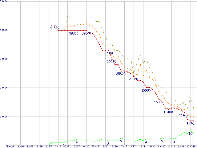 PC3-12800 4GB×2枚組みセットの価格推移↓次グラフ(2009年10月24日〜2011年1月8日)※このグラフは過去のデータも税率5%相当に調整した税込み相当額のグラフです。●関連グラフメモリ主要製品の最安値推移メモリ主要製品(最安値5千円〜1万円未満)の最安値推移PC3-12800(DDR3-1600) DDR3 SDRAM DIMMの最安値推移●凡例最安値(点線部は販売店未確認または未調査)平均値最高値ショップ数
