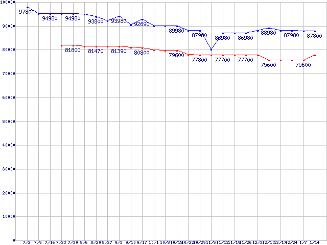 | CPU主要製品(最安値6万円以上)の最安値推移 |