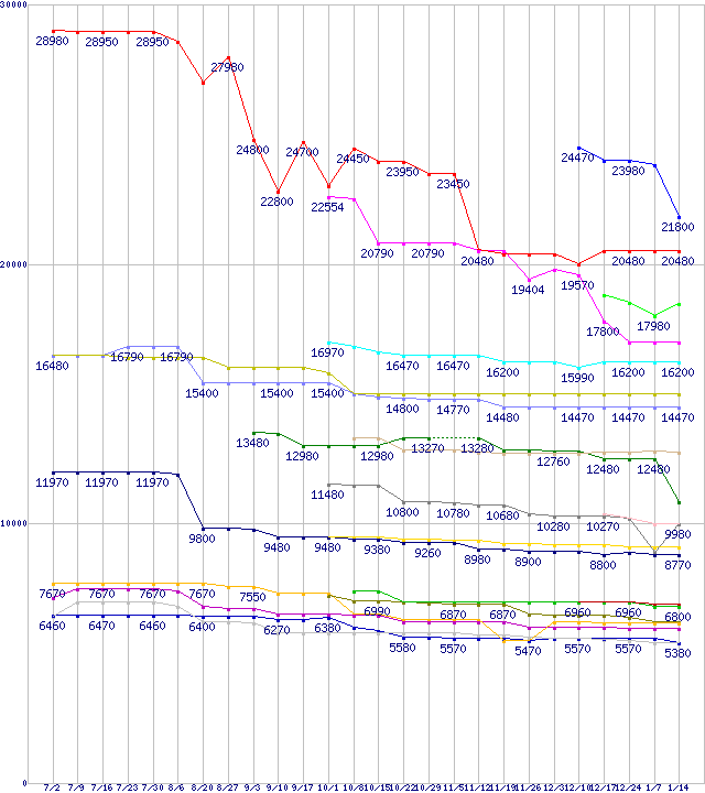 AMD系CPUの最安値推移↑前グラフ↓次グラフ(2010年7月2日〜2011年1月14日)※このグラフは過去のデータも税率5%相当に調整した税込み相当額のグラフです。凡例Phenom II X6 1100T Black Edition (3.3GHz,L2 512KB×6,L3 6MB,TDP 125W)Phenom II X6 1090T Black Edition (3.2GHz,L2 512KB×6,L3 6MB,TDP 125W)Phenom II X6 1065T (2.9GHz,L2 512KB×6,L3 6MB,TDP 95W)Phenom II X6 1075T (3.0GHz,L2 512KB×6,L3 6MB,TDP 125W)Phenom II X4 970 Black Edition (3.5GHz,L2 512KB×4,L3 6MB,TDP 125W)Phenom II X4 910e (2.6GHz,L2 512KB×4,L3 6MB,TDP 65W)Phenom II X4 965 Black Edition (3.4GHz,L2 512KB×4,L3 6MB,TDP 125W)Athlon II X4 615e (2.5GHz,L2 512KB×4,TDP 45W)Phenom II X4 955 (3.2GHz,L2 512KB×4,L3 6MB,TDP 95W)Phenom II X2 565 Black Edition (3.4GHz,L2 512KB×2,L3 6MB)Athlon II X4 645 (3.1GHz,L2 512KB×4,TDP 95W)Phenom II X2 560 Black Edition (3.3GHz,L2 512KB×2,L3 6MB)Athlon II X4 640 (3.0GHz,L2 512KB×4,TDP 95W)Athlon II X3 450 (3.2GHz,L2 512KB×3,TDP 95W)Athlon II X2 250e (3.0GHz,L2 1MB×2,TDP 45W)Athlon II X2 265 (3.3GHz,L2 1MB×2,TDP 65W)Athlon II X2 245e (2.9GHz,L2 1MB×2,TDP 45W)Athlon II X2 260 (3.2GHz,L2 1MB×2,TDP 65W)Athlon II X2 255 (3.1GHz,L2 1MB×2,TDP 65W)Athlon II X2 240e (2.8GHz,L2 1MB×2,TDP 45W)※製品名をクリックすると個別のグラフを表示します※点線部は販売店が確認できなかった、または調査データがないことを示します